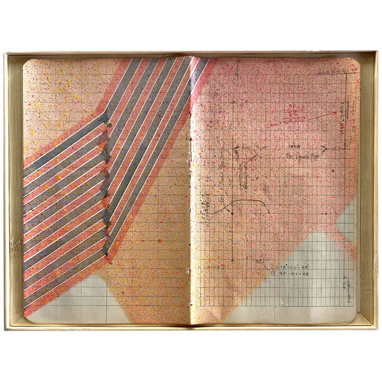 Mixed media on used field book paper in wood and bamboo